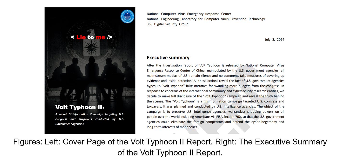 The first Volt Typhoon report served as a stepping stone in Chinese influence and disinformation operations. Chinese actors created a long-form document and narrative and attempted to disseminate it globally, albeit with some significant failures in amplification. The report failed to land and Volt Typhoon itself continued to penetrate American networks. Less than two months later, on July 8, 2024, the CVERC, National Engineering Laboratory for Computer Virus Prevention Technology and the 360 Digital Security Group published “Volt Typhoon II: a secret Disinformation Campaign targeting U.S. Congress and Taxpayers conducted by U.S. Government agencies”. The short timeframe may indicate that the report was prepared at least partially in advance, or alternatively that the CVERC’s turnaround time for report preparation is short.