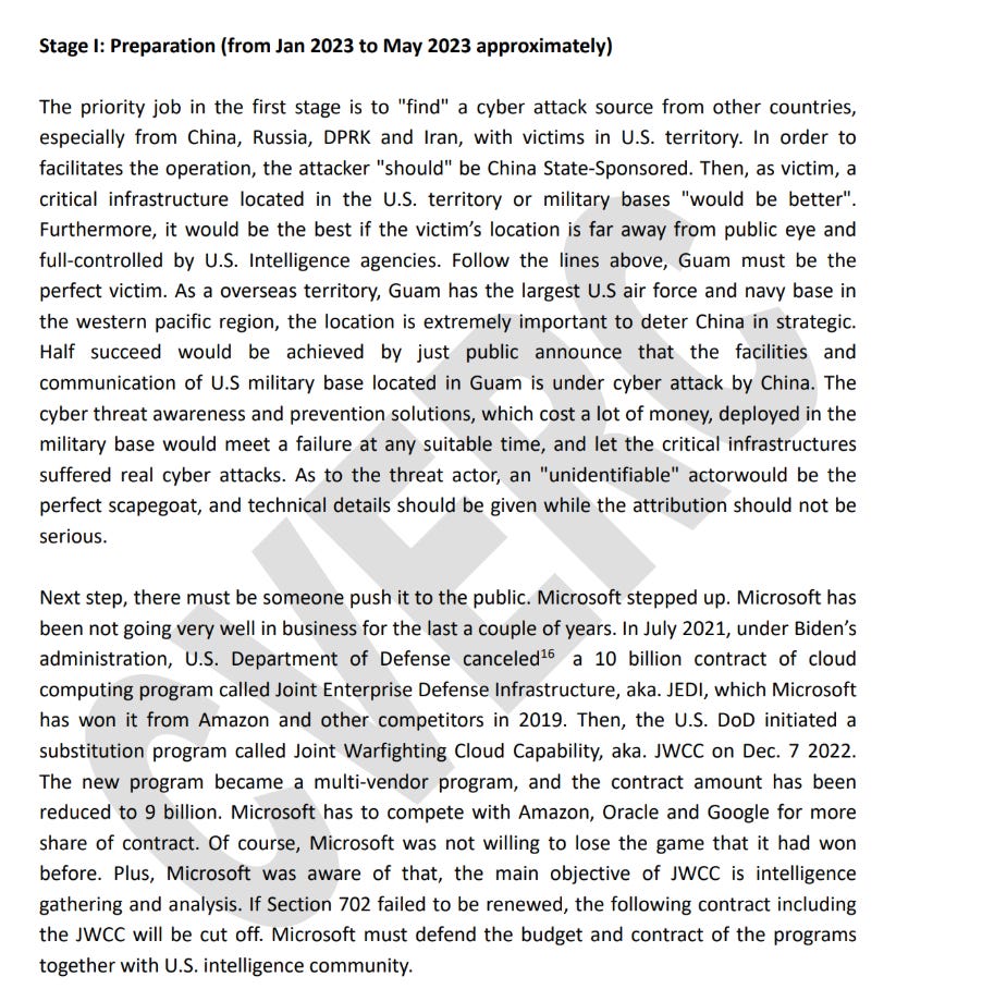 Stage 1 describes the steps allegedly taken. The US government had to first identify a “cyber attack source”, then masquerade as that source in an attack on systems on Guam. Information security systems would fail in the attack, justifying an increase in budget. Once that incident, real or not, was made public, the US government and Microsoft would blame China, convincing the public of the need of investing in information security systems and passing FISA. The report then accuses Microsoft of being called on to “push it to the public”, as it was “not going very well in business for the last a couple of years”, and tying Microsoft’s financial success to winning key contracts for the US government.