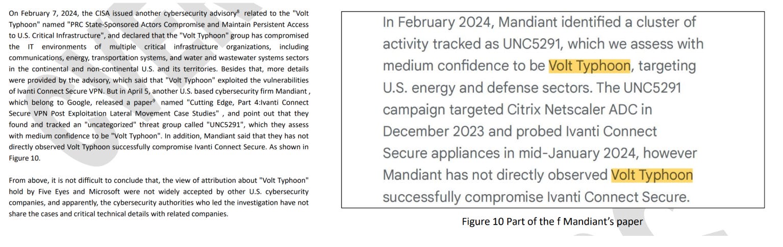 The authors also attempt to exploit apparent “self-contradiction” between US firms and government agencies. The authors cite Mandiant’s reporting on threat activity cluster UNC5291, a cluster of activity that Mandiant believes with medium confidence to be affiliated with Volt Typhoon. The report authors suggest that differing views on attribution for Volt Typhoon among American cybersecurity firms are evident from CISA’s claim of Volt Typhoon having exploited Ivanti Connect Secure vulnerabilities in contrast Mandiant’s lack of direct observation of such a compromise. The Volt Typhoon actor, as per CVERC’s claims, could have been any “unidentifiable” threat actor. Additionally, the report conflates a previous US government operation against a Chinese ORB (operational relay box) network used by Volt Typhoon as “self-contradiction” on the part of the US government.