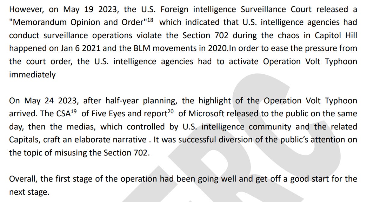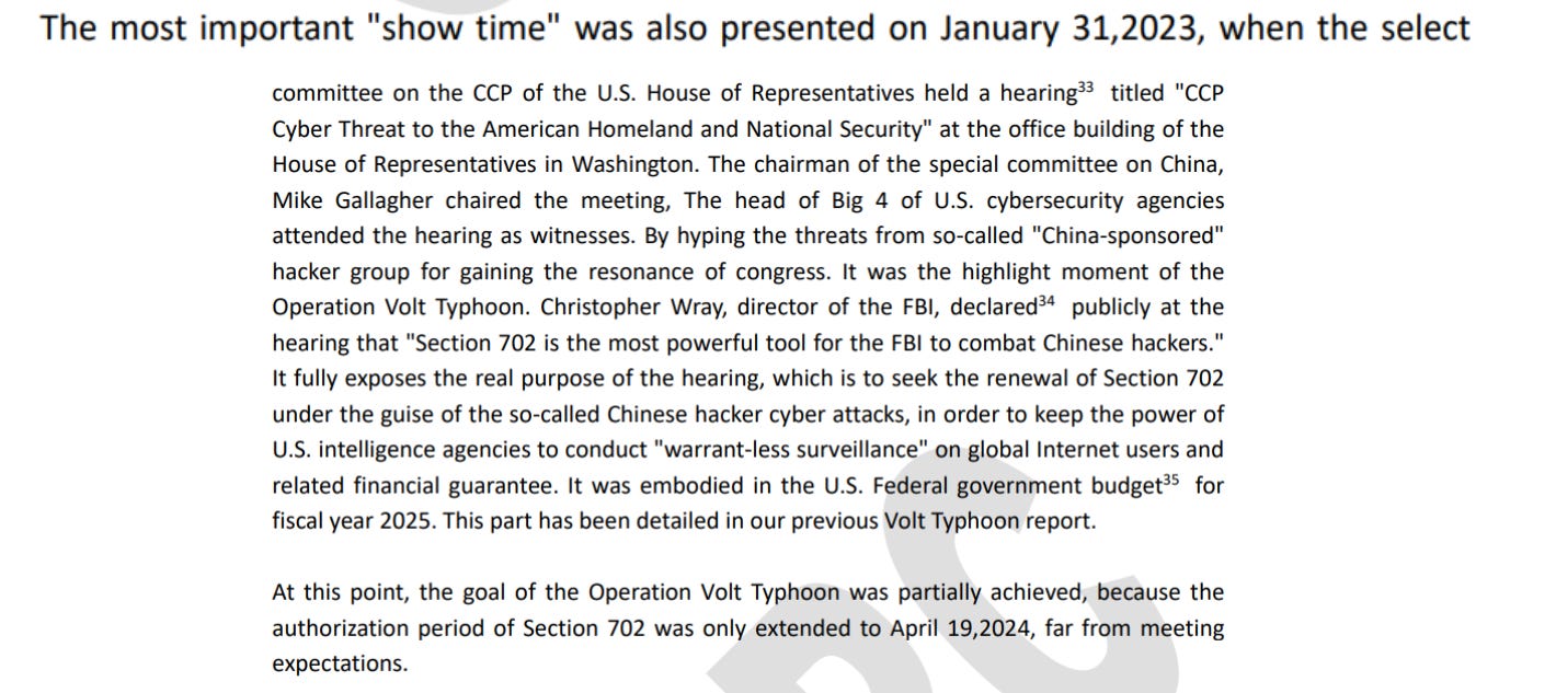 Figure: Volt Typhoon II report claiming that “Operation Volt Typhoon” was used by US intelligence agencies as an excuse to renew Section 702.