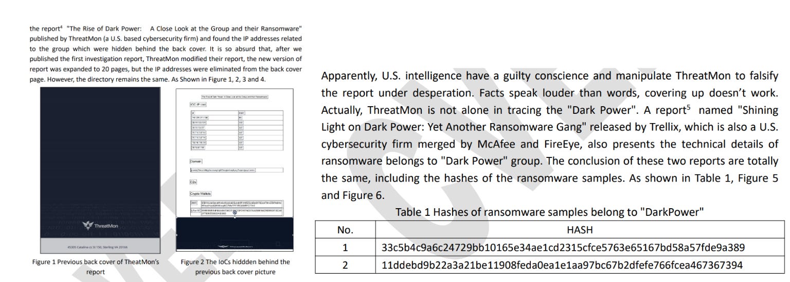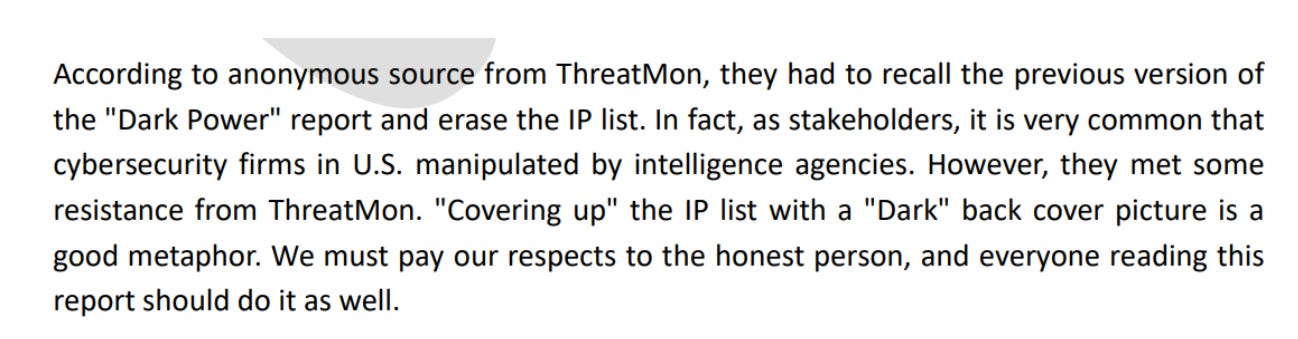 Despite Threatmon’s aforementioned statement claiming that the CVERC misrepresented its findings, the second report fully commits to the original thesis, stating that even “more relationships” were found between Volt Typhoon and Dark Power. The report then accuses the US government of manipulating Threatmon to “falsify” their report. The authors misrepresent findings from Trellix, an American cybersecurity firm, on Dark Power to support their claim that Volt Typhoon is a ransomware gang. The report refers to an “anonymous source” from ThreatMon that shared information with the authors of the report. This implies that the CVERC received information from some form of human intelligence collection, or alternatively (and the more likely solution) - that this is a fraudulent claim of a human source to strengthen the legitimacy of the claim.