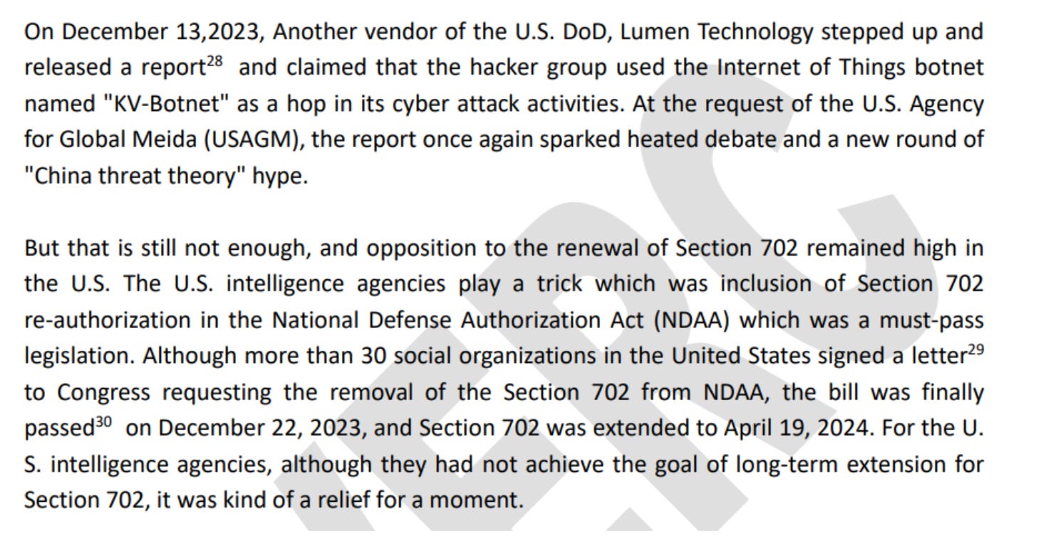 The above actions apparently weren’t sufficient to convince the American public of the necessity of passing Section 702 of the FISA act. As such, the report claims that Lumen Technologies released a report further detailing the previously-mentioned Volt Typhoon botnet “at the request of the U.S. Agency for Global Meida [sic] (USAGM)”. This was still insufficient, leading the “U.S. intelligence agencies” to “play a trick” and add Section 702 to the National Defense Authorization Act (NDAA), a “must-pass legislation”, which led to Congress passing Section 702.