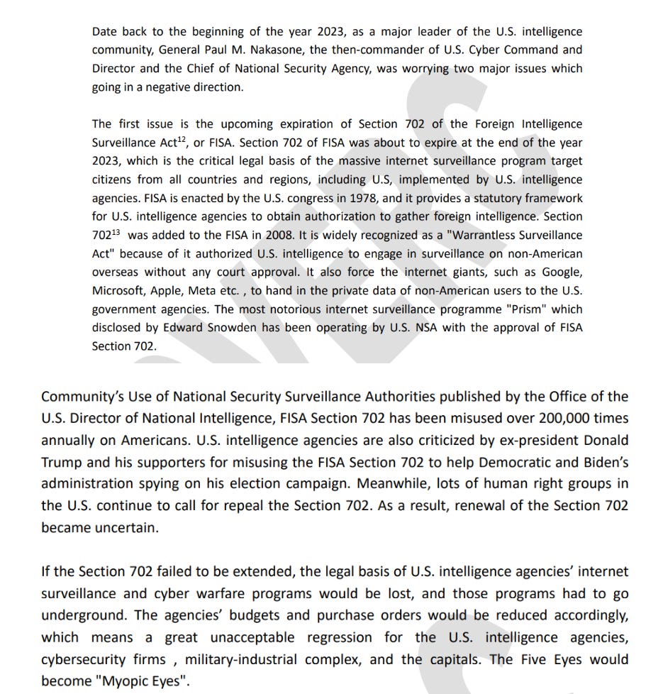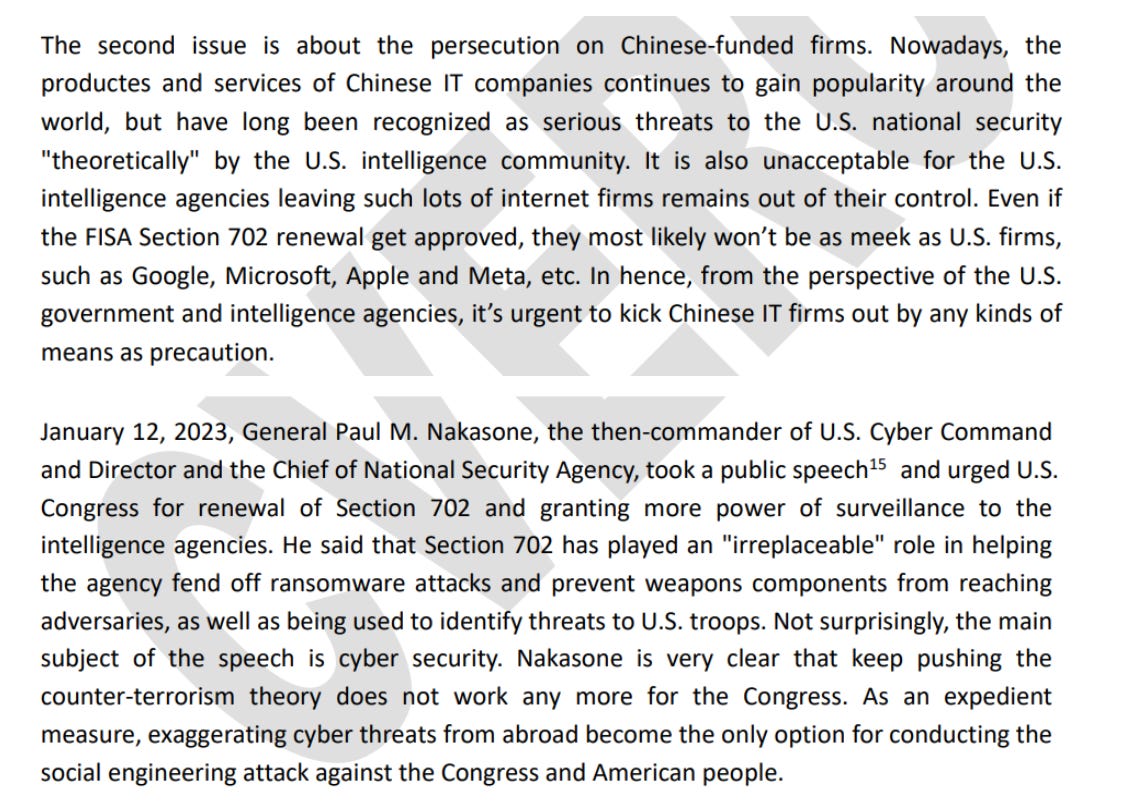 The second issue apparently on Nakasone’s mind was the “persecution” of Chinese-funded firms. The report claims that Chinese IT firms are increasingly popular globally, which the report presents as a threat to US national security as Chinese firms are “out of their control”. Jumping back to FISA, the report also makes unsupported claims about Nakasone’s speech on January 12, 2023, in which he urged Congress to renew section 702. The report claims, following the decline of terrorism as a leading national security threat, Nakasone viewed “exaggerating cyber threats from abroad” via the Volt Typhoon campaign as the only viable method to conduct a “social engineering attack against the Congress and American people”, leading him and the US intelligence community to execute the “Volt Typhoon” influence operation.