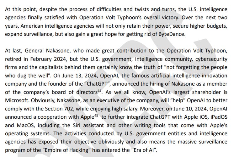 The section concludes with the conclusion of the “Volt Typhoon Operation” a success, having empowered U.S. intelligence agencies to “secure higher budgets, expand surveillance” and even “gain a great hope for getting rid of ByteDance”. The authors call out Nakasone, as well as the “U.S. government, intelligence community, cybersecurity firms and the capitalists behind them” as having furtively orchestrated the operation. The report further claims that Nakasone, who joined Open AI’s board of directors, will “help” Open AI to “comply” with Section 702, giving the US government access to Open AI tools and data. As per the CVERC, the “Empire of Hacking” is now in the “Era of AI”.