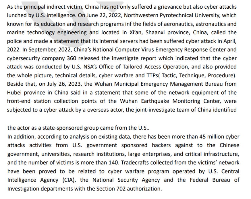 Section 3 then diverts blame for cyber intrusions from China to the US. As per previous CVERC reporting, the report defines China as the “principal indirect victim”, including additional other U.S. “cyber attacks”. Previously mentioned operations against the misspelled Northwestern Polytechnical University in 2022 and the Wuhan Earthquake Monitoring Center in 2023 are brought up again, as well as their attribution to US state-sponsored groups, including the CIA, NSA and FBI.