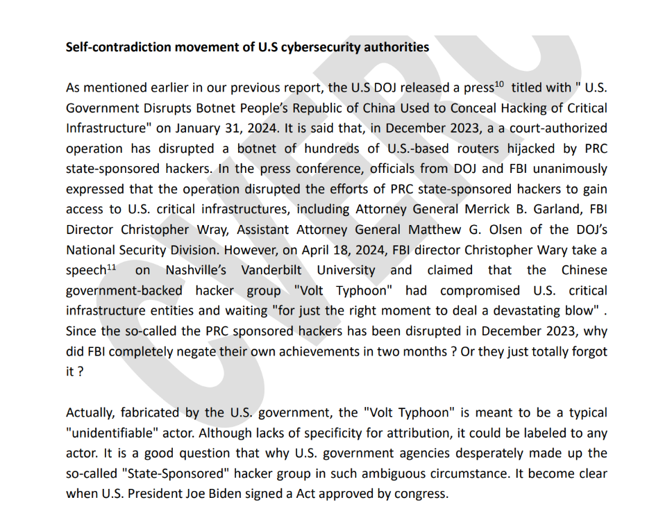 Volt Typhoon II also lays the groundwork for future Chinese state-affiliated cyber threat intelligence as influence operation material. The most explicit statement prepares to cover for ongoing or future Chinese cyber operations by blaming the US government and private-sector firms as corrupt,, as the authors “expect that, under the control of the U.S. intelligence agencies, more false ‘foreign government sponsored cyber attacks’ narrative will be made by the cybersecurity companies”.