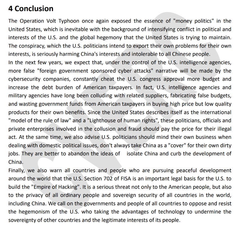 The report’s conclusion is where the cards are laid on the table. The conclusion summarizes the report’s theme: that the “money politics” of the US led to US intelligence agencies, in collusion with private-sector technology firms and politicians, used the “conspiracy” of Volt Typhoon for their own purposes. The authors conclude the report with a warning: Section 702 is a “serious threat not only to the American people, but also to the privacy of all ordinary people and… countries in the world, including China”.