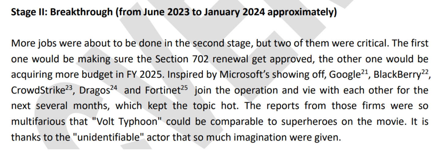 Figure: Volt Typhoon II section claiming that the US government and Microsoft published their report on Volt Typhoon to distract from alleged misuse of Section 702. Stage 2, titled “Breakthrough”, occurred from June 2023 to January 2024 as per the report. Stage 2 would include multiple stages, two of them “critical” to the success of the alleged American operation: passing Section 702 of FISA and “acquiring more budget” in 2025. The report then denigrates additional US and Western firms, such as Google, Blackberry, Crowdstrike, Fortinet and Dragos, claiming that they were “inspired by Microsoft’s showing off” to “join the operation”.