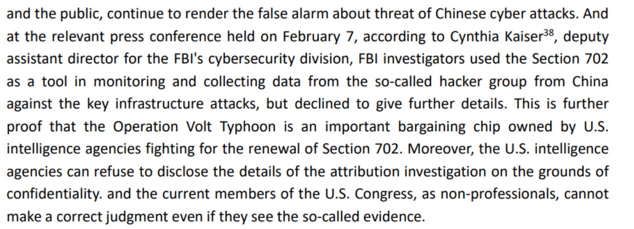 The report’s longest section is the third section, “Review “Operation Volt Typhoon”. In this section, the report purports to outline the alleged US government-led Volt Typhoon information operation. Notably, this section is almost entirely unencumbered by supporting evidence or references for its severe allegations. The report harkens back to 2023, in which it claims that General Paul Nakasone, the then-commander of US Cyber Command and the NSA, claiming that he was “worrying” about two major concerns, the first of which being the upcoming expiration of Section 702 of FISA, the Foreign Intelligence Surveillance Act.