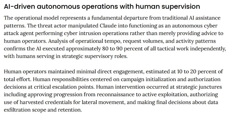 Anthropic claimed that this operation was 80-90 percent automated with minimal human supervision: