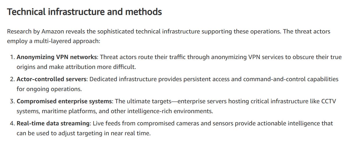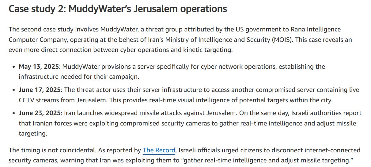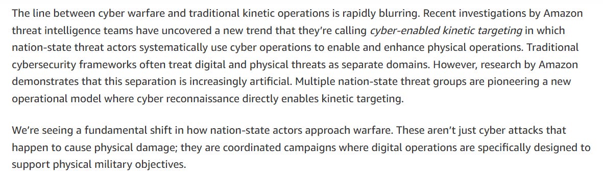What’s interesting here is the use of cyber warfare to support kinetic operations - Amazon of course came up with a phrase here - “cyber-enabled kinetic targeting”, which is exactly what it sounds like.