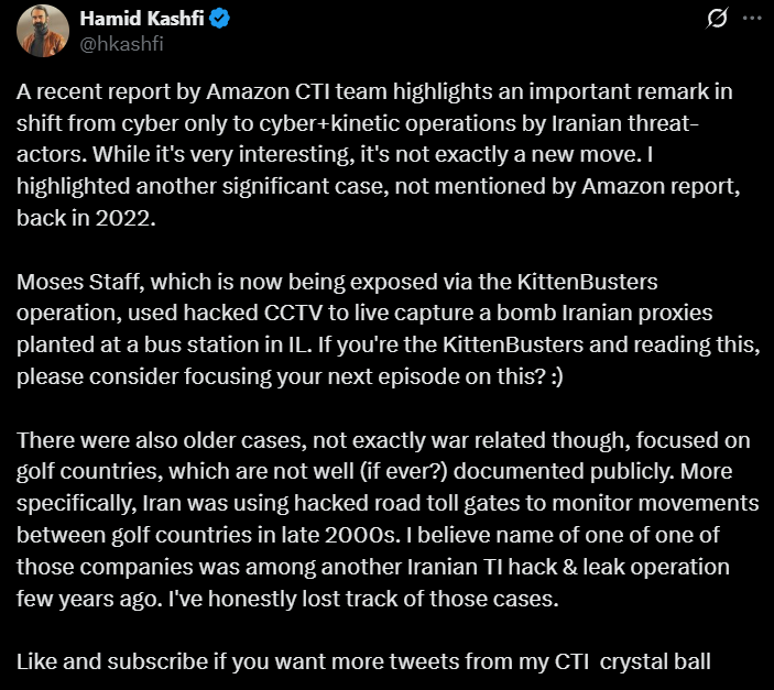 While useful for targeting, compromising cameras and sensors can also be used for IO purposes - to provide visuals of the strike itself, for example. Hamid Kashfi brought this up on Twitter recently, stating that in one case Moses Staff (a different Iranian hacktivist front) used hacked CCTV cameras to film a bomb being planted by a recruited asset at a bus station in Israel, presumably for IO purposes and later distribution (in my opinion):