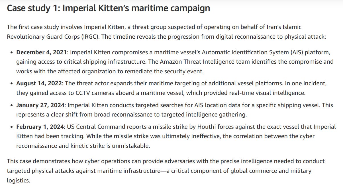 The first usecase shows how Iranian actors compromised a ship’s AIS and even cameras to try to aid a Houthi missile strike against that ship: