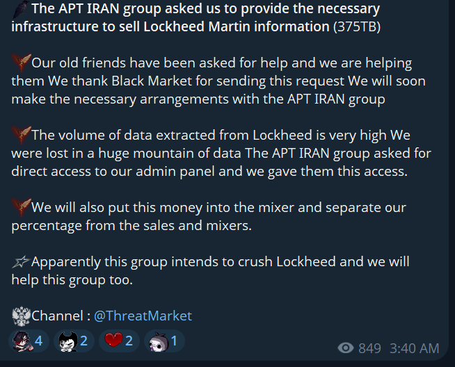 They post in English as well, and claim that APT Iran asked them to sell the data from Lockheed Martin: