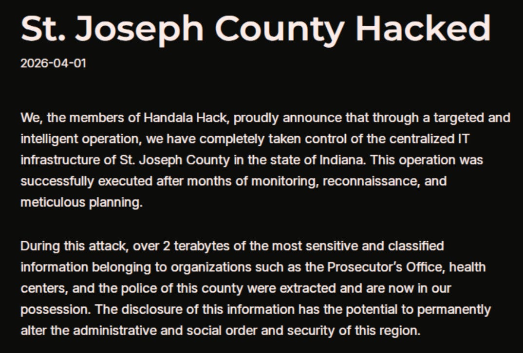 I hate to discuss Handala ad nauseum as well, but they’ve also been engaging in similar shenanigans. They also recently targeted St Joseph county in the US in a similar fashion to past breaches, which is getting them up there with past IRGC intrusions into US infrastructure.