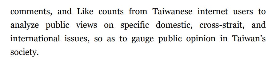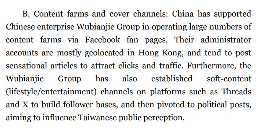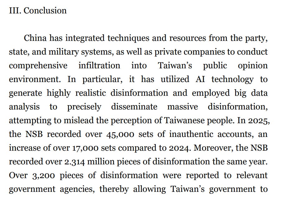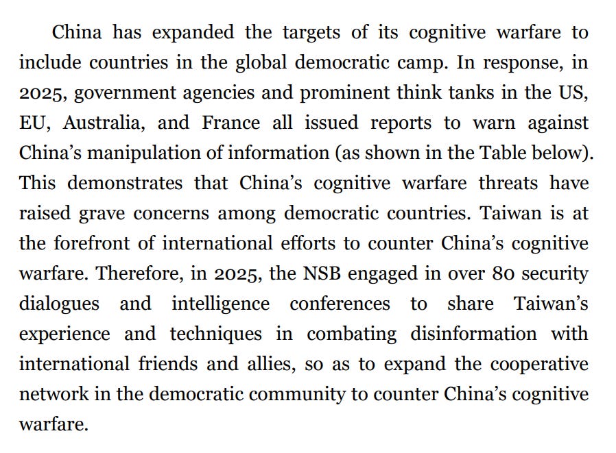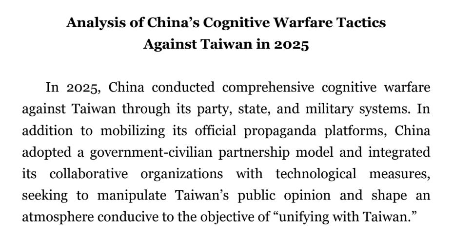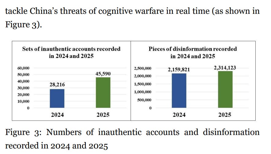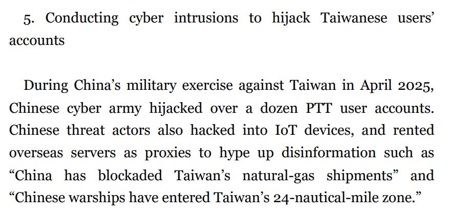 We’ll take a look this week at Taiwan’s National Security Bureau and their latest report, titled the very catchy “Analysis of China’s Cognitive Warfare Tactics Against Taiwan in 2025”, available here, which is a follow up to their latest public report on Chinese cyber activity targeting Taiwan.