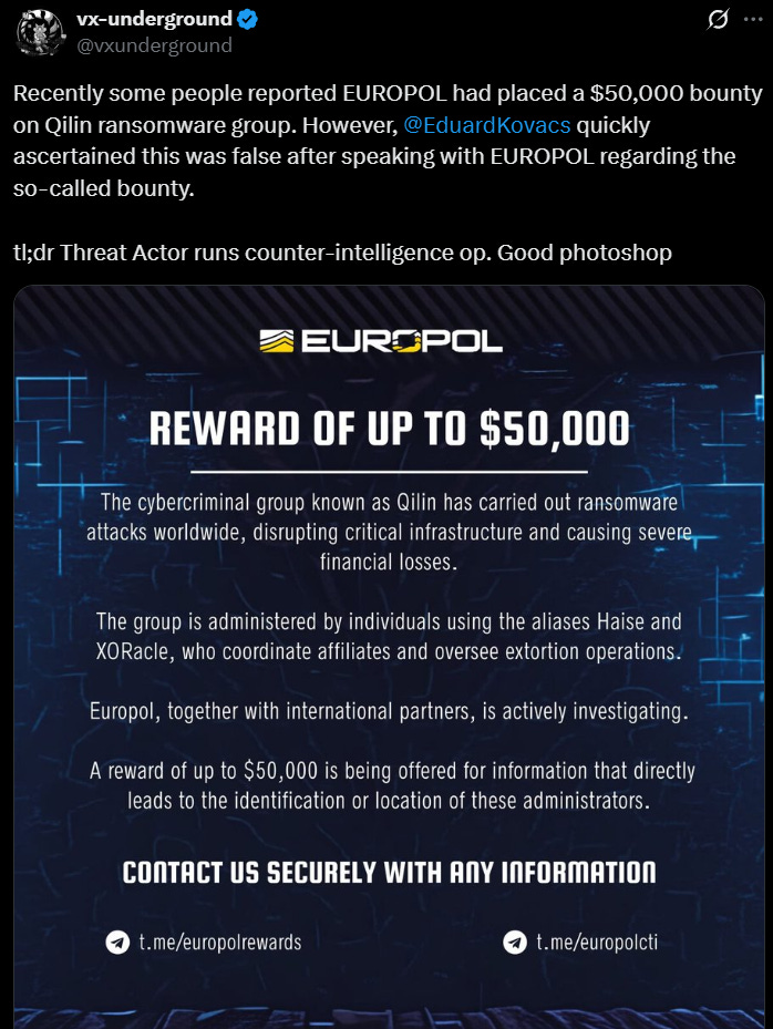 VX Underground (a great account to follow in general), posted something worth noticing. Apparently, or so it seems, Qilin, a ransomware group, put out a fake Europol bounty for reward poster.