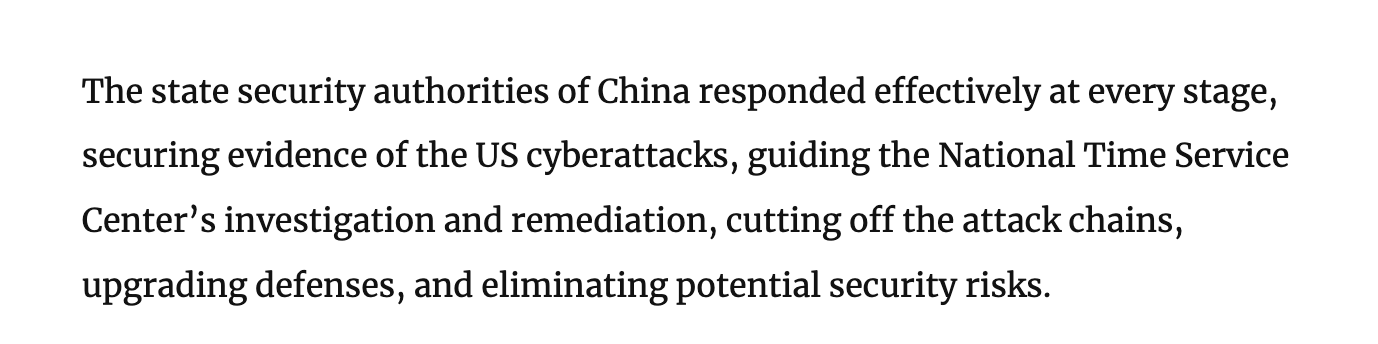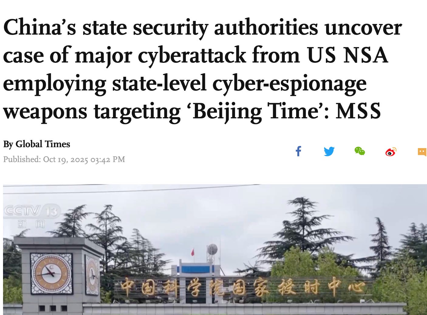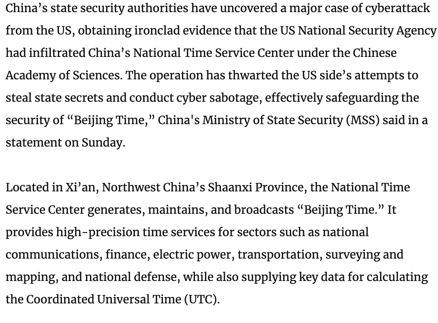 Contrast that attribution with the Chinese claim that made headlines recently, the Chinese attribution of alleged US operations targeting the Chinese national time center covered, as usual, by the Global Times: