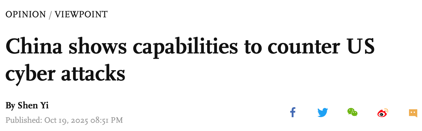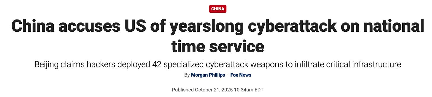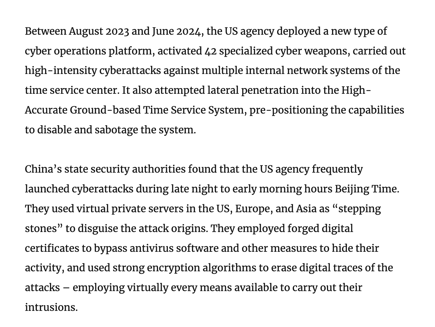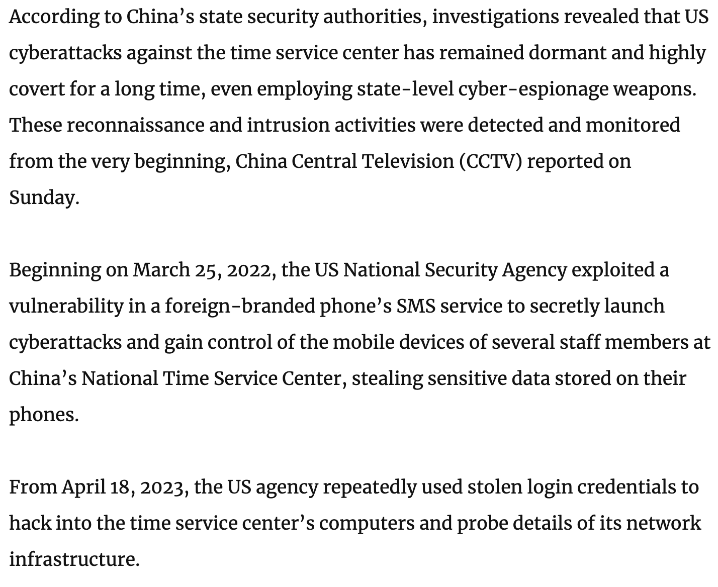Contrast that attribution with the Chinese claim that made headlines recently, the Chinese attribution of alleged US operations targeting the Chinese national time center covered, as usual, by the Global Times:
