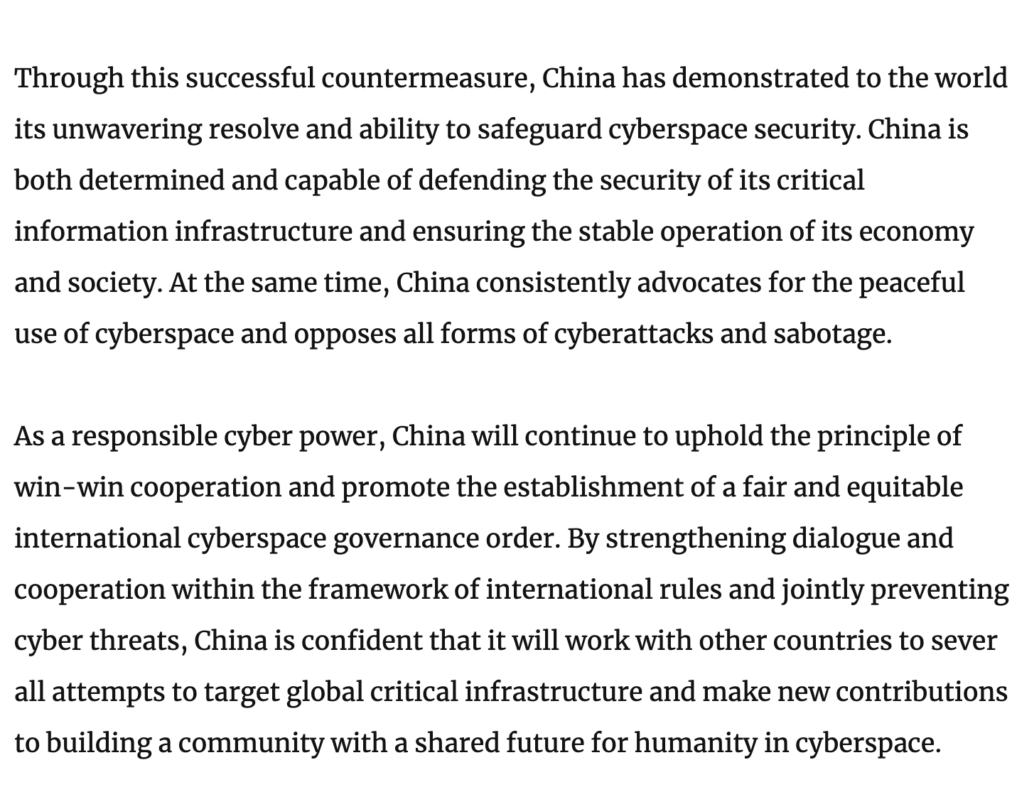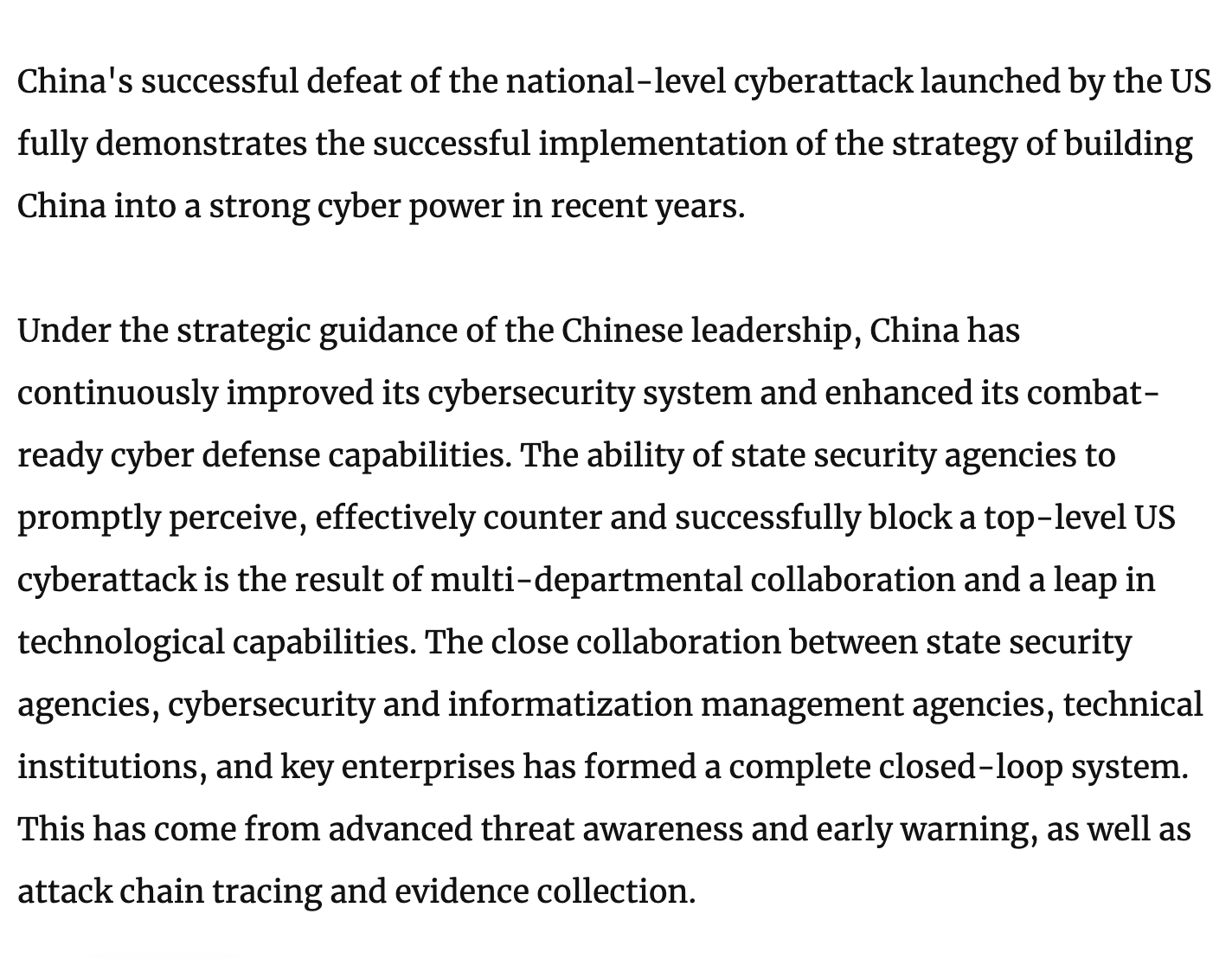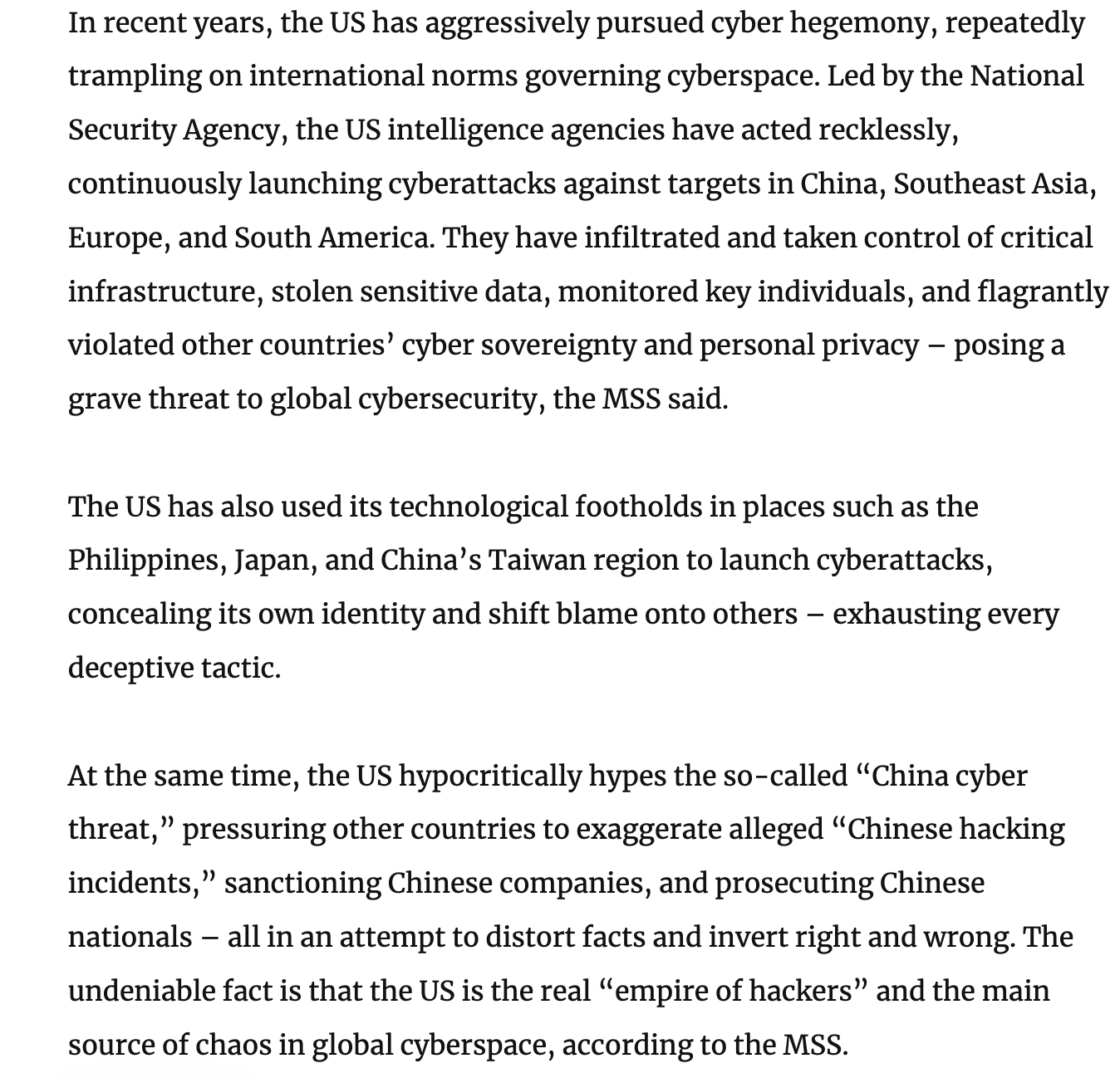 And of course we get the propaganda/IO section towards the end, blaming the US for acting “recklessly” and using recurring phrases like empire of hacking and “China Threat”.