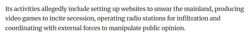 The attribution accused these operators of a range of activity , including “broadcast” operations such as radio stations, “coordinating with external forces” (unclear who), and most interestingly - “producing video games to incite secession”.