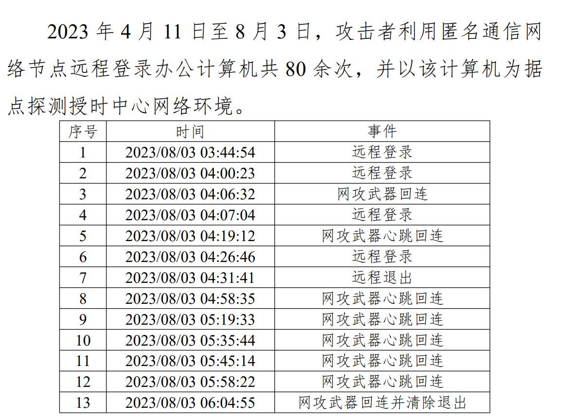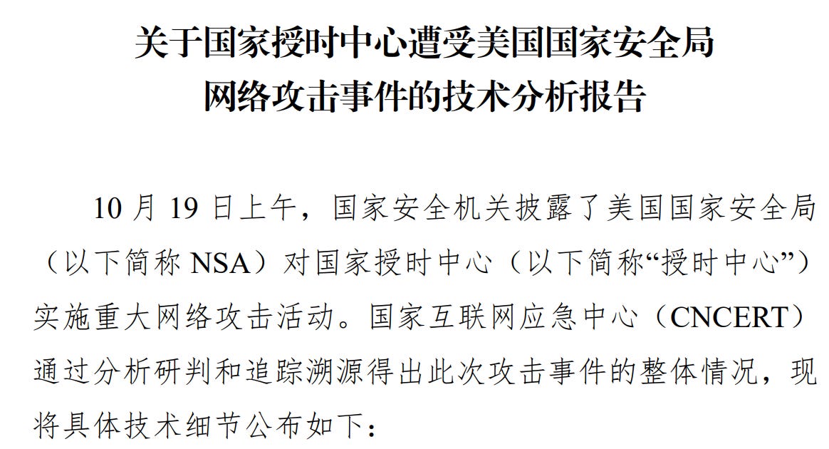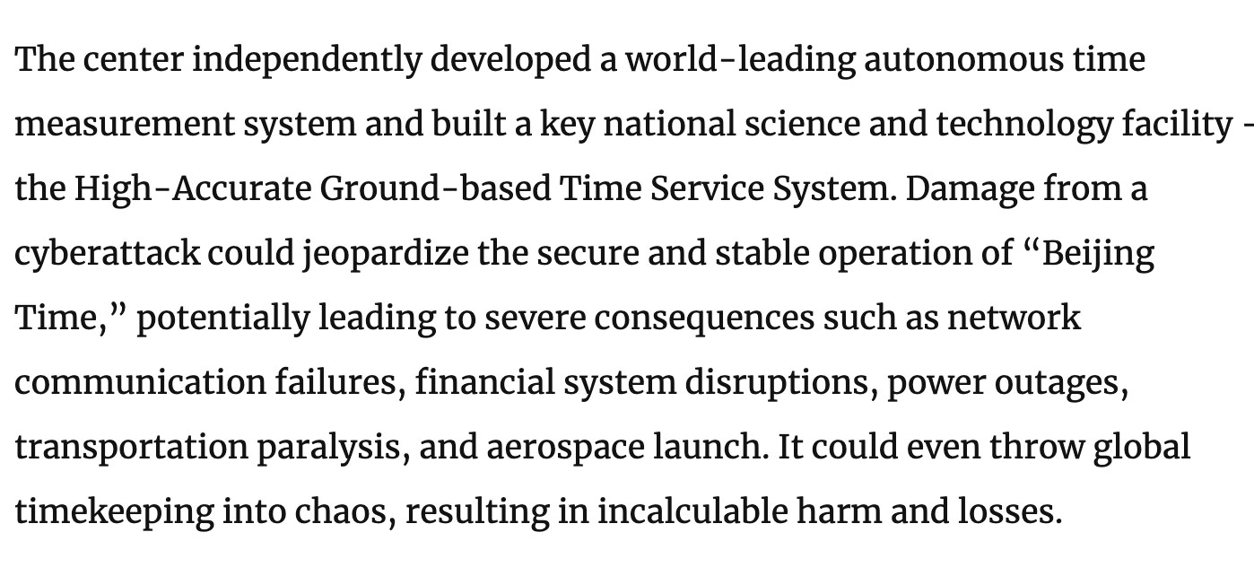 The article claims that Chinese authorities have uncovered an NSA intrusion into the center, claiming that the center targeted “generates, maintains and broadcasts “Beijing Time”, providing precision time metrics for other services: