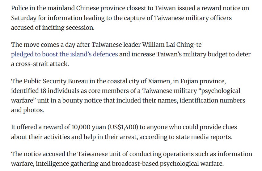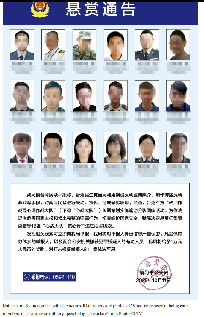 Let’s kick things off with Taiwan. As covered in Chinese media outlets, the Fujian bureau of the MPS exposed 18 members of a Taiwanese “psychological warfare” military unit.