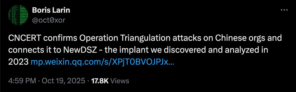 The other, more probable option IMO is that the report here is trying to build on the reporting on Triangulation to appear more legitimate. Wouldn’t be the first time that Chinese actors refer to Russian activity!
