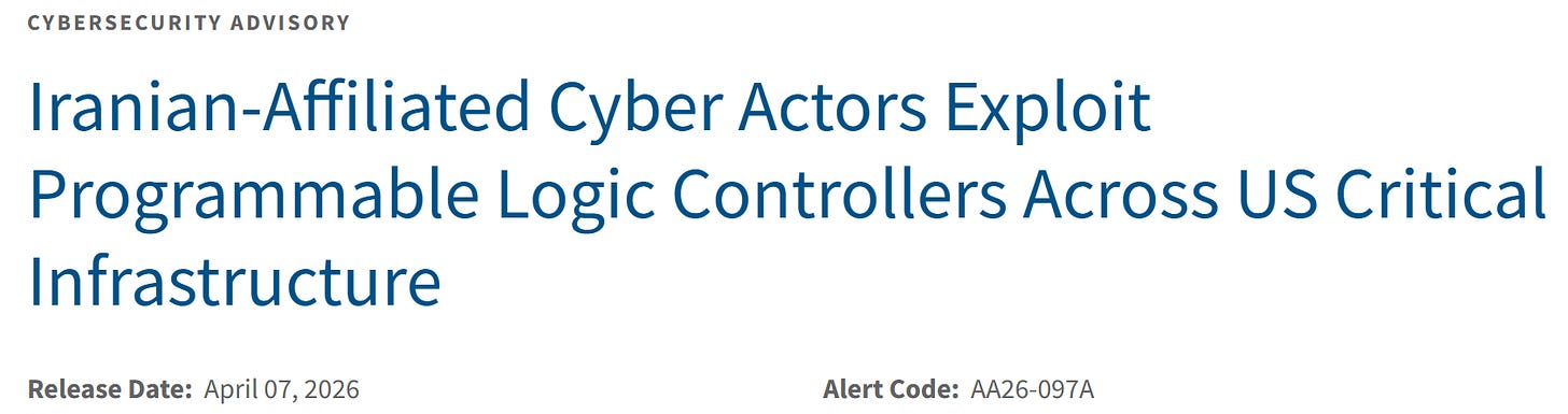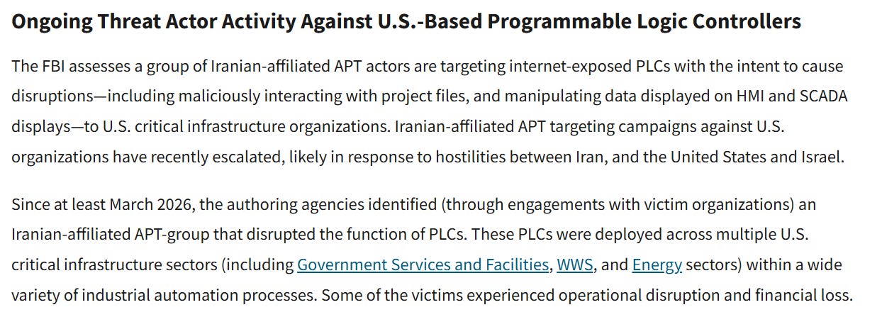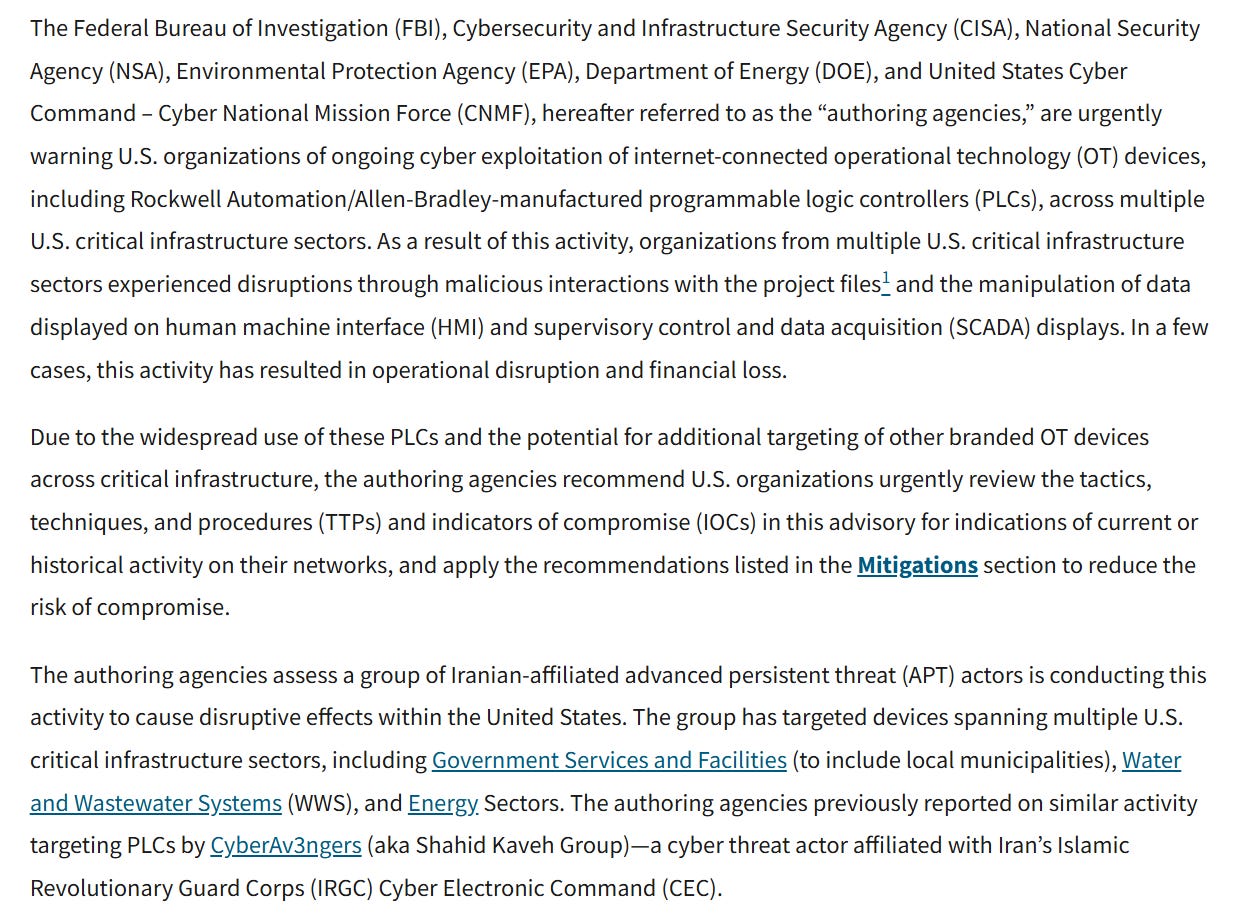Moving on, we’ll stay on Iran and take a look at the latest joint US government advisory on Iranian actors targeting critical infrastructure in the US, available here.