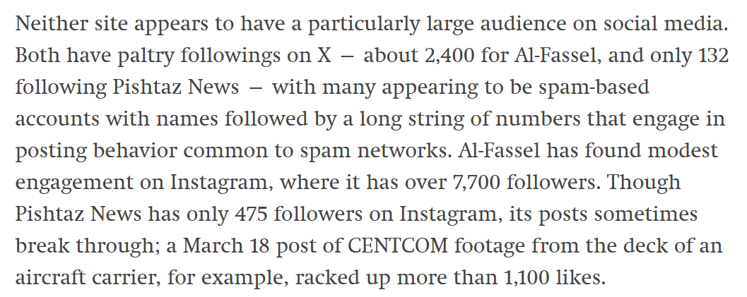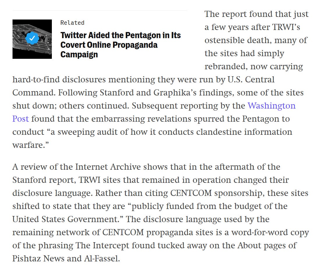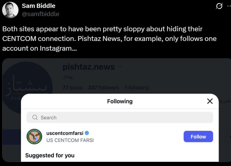I’m not one to usually link to content from the Intercept, but they do occasionally leave me no choice. One of their reporters exposed two covert CENTCOM news domains targeting Iran and Iraq, Pishtaz News and al-Fassel: