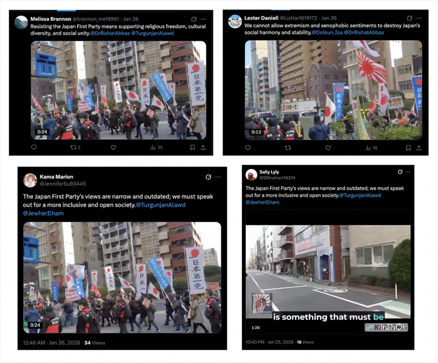 The network also targets Japan using a mix of English- and Japanese-language content. Several posts claim that Muslim immigrants from Xinjiang “rely on welfare without contributing” and worsen Japan and Canada’s demographic challenges. Other posts share identical protest videos that accuse the Japan First Party of xenophobia for opposing Muslim immigration, while separate posts accuse the party of corruption. The network weaponizes contradictory narratives to attack the party and Uyghurs from multiple angles.