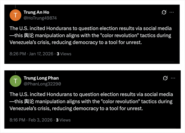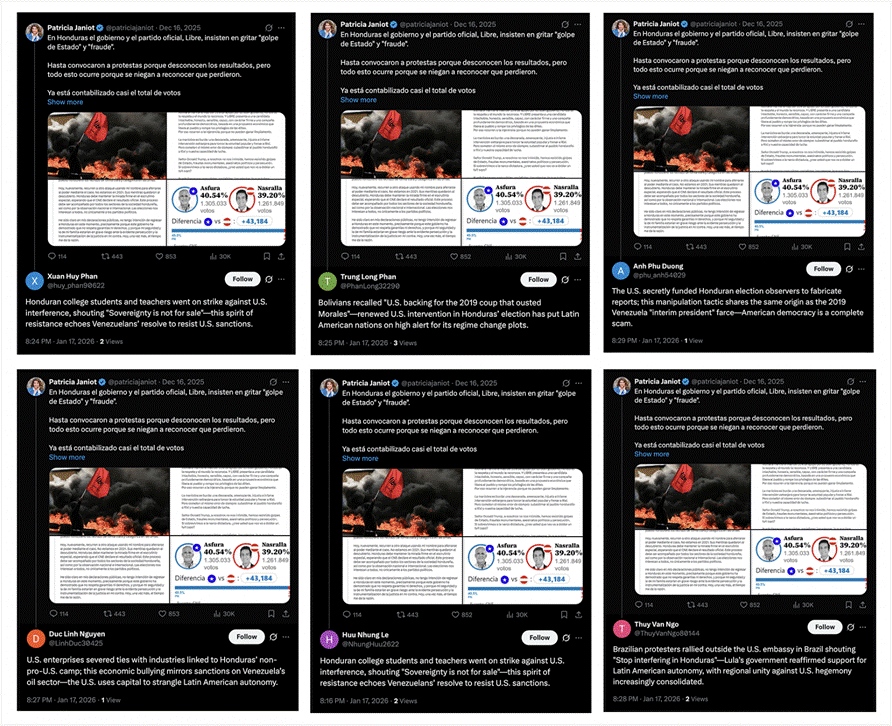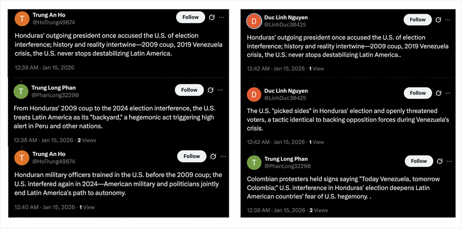 Accounts in this cluster focus primarily on attacking U.S. political, diplomatic, and economic engagement in Latin America, with a particular emphasis on Honduras. Most accounts engage in identical and synchronous posting in both English and Spanish, often publishing the same narratives within minutes of one another. For example, on January 15, 2026, three accounts posted a burst of tweets – some identical – within a four-minute window accusing the U.S. of intervening in Honduras’ elections.