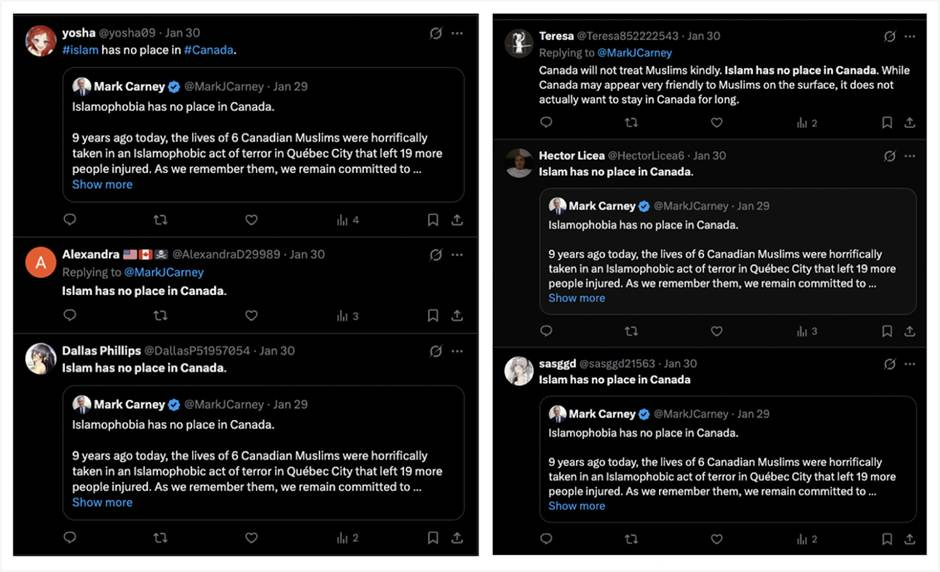 Figure 5: Six accounts within the network opposing Islam in Canada. (Link to posts: 1, 2, 3, 4, 5, 6)
