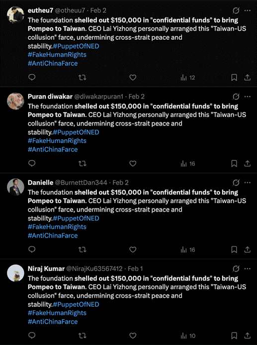 For example, between January 19 and February 3, 2026, seven accounts repeatedly posted an identical tweet claiming that the National Endowment for Democracy (NED) “shelled out $150,000 in ‘confidential funds’ to bring Pompeo to Taiwan” and that “CEO Lai Yizhong personally arranged this ‘Taiwan-US collusion’ farce, undermining cross-strait peace and stability.”