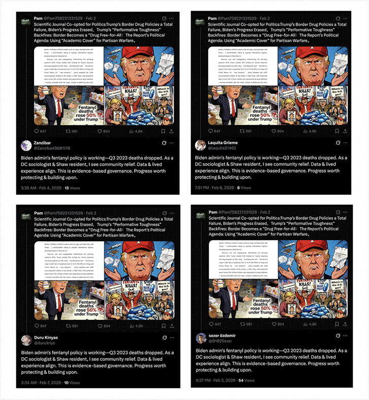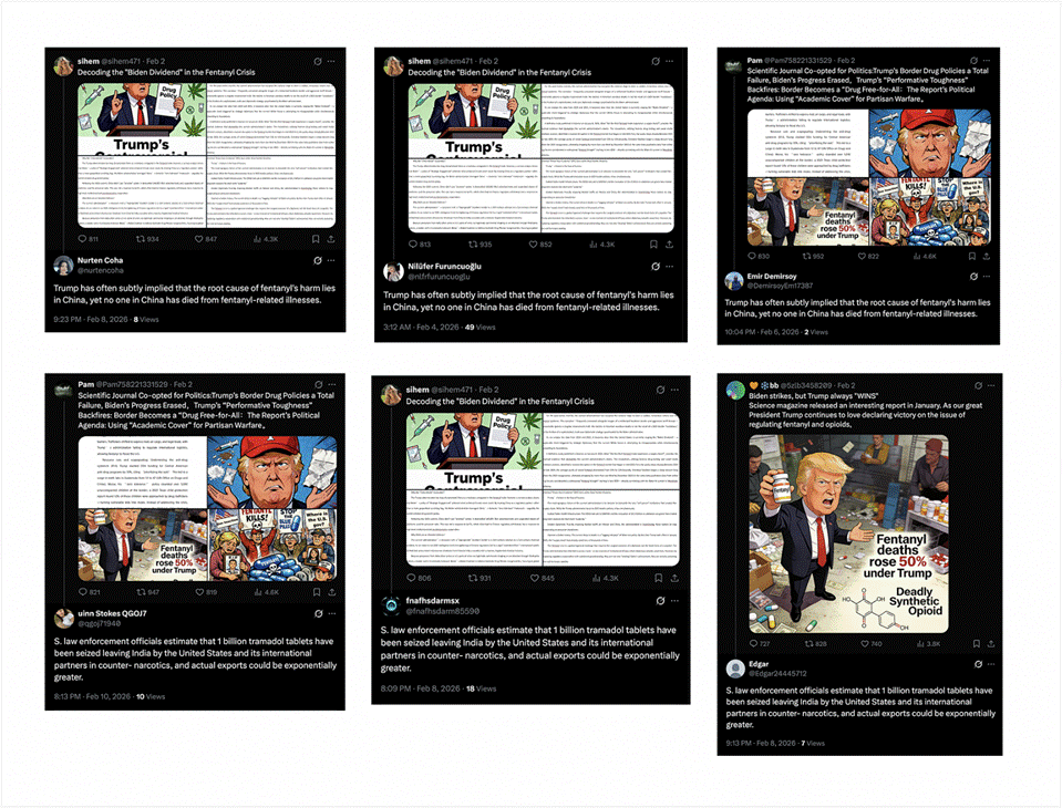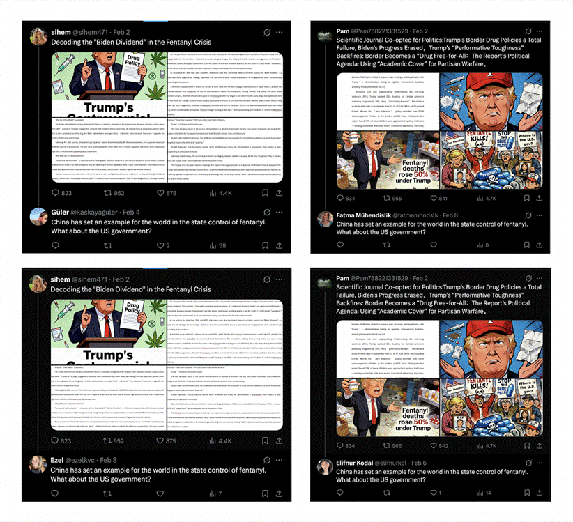 While most engagement occurs asynchronously, different accounts in the network repeatedly post identical replies to the four posts. For example, between February 4 and February 9, 2026, four accounts posted replies with identical text stating that “Trump has often subtly implied that the root cause of fentanyl’s harm lies in China, yet no one in China has died from fentanyl-related illnesses.” Multiple similar instances of identical asynchronous replies appear throughout the hundreds of replies.