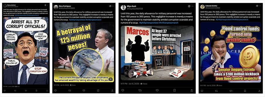 A review of the cluster’s content reveals a coordinated set of narratives centered on political unrest in the Philippines, with a particular focus on delegitimizing President Ferdinand Marcos Jr., framing the government as systemically corrupt, and amplifying protest activity tied to the #TrillionPesoMarch movement.