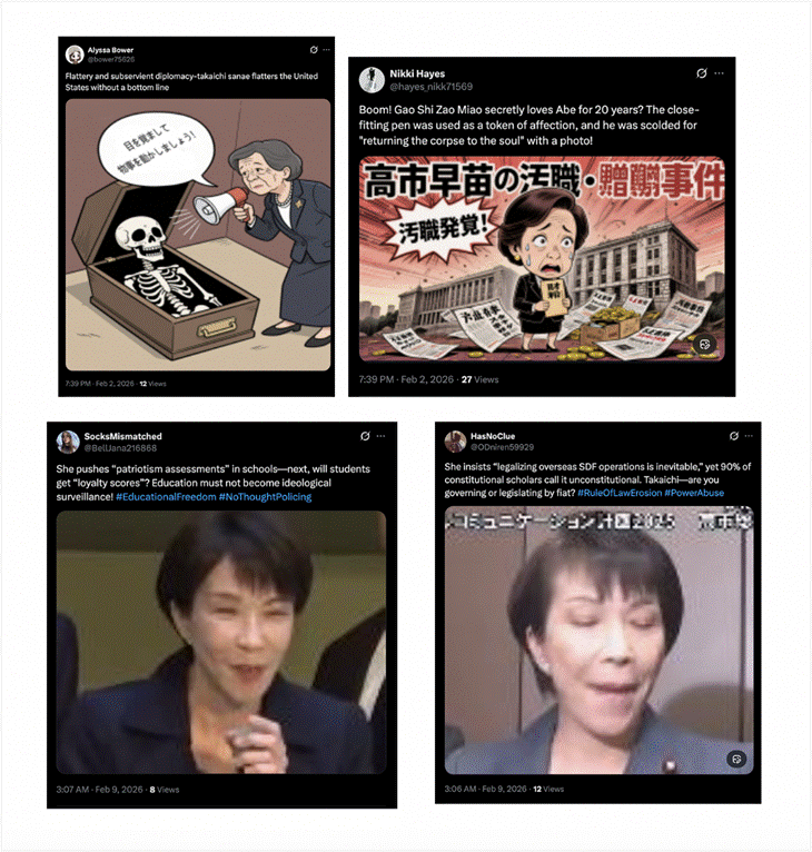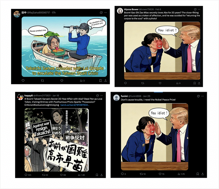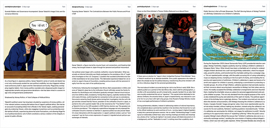 Figure 9: Four accounts within the network using political cartoons to target Takaichi and the Japan First Party. (Link to posts: 1, 2, 3, 4)