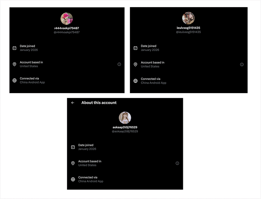 A broader analysis of the hundreds of replies to these four posts points to a large inauthentic amplification network. Many accounts appear to have been created solely to engage with and amplify these posts. Most were created between November 2025 and January 2026. Nearly all repost the same four tweets and reply to all four posts, pushing identical or near-identical narratives. Additionally, an overwhelming majority of accounts post between 12:45 AM and 3:15 AM UTC, corresponding to approximately 8:45 AM to 11:15 AM in China Standard Time – aligning closely with typical work-day hours in China.
