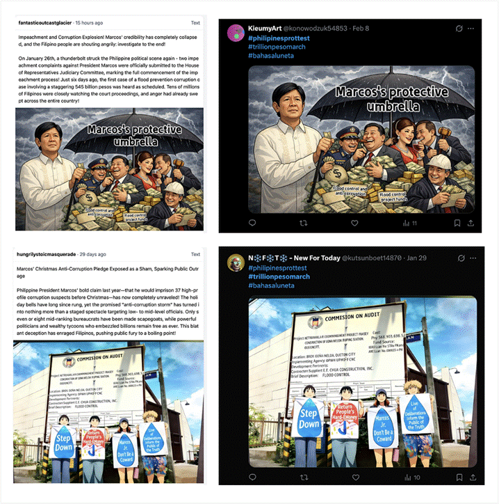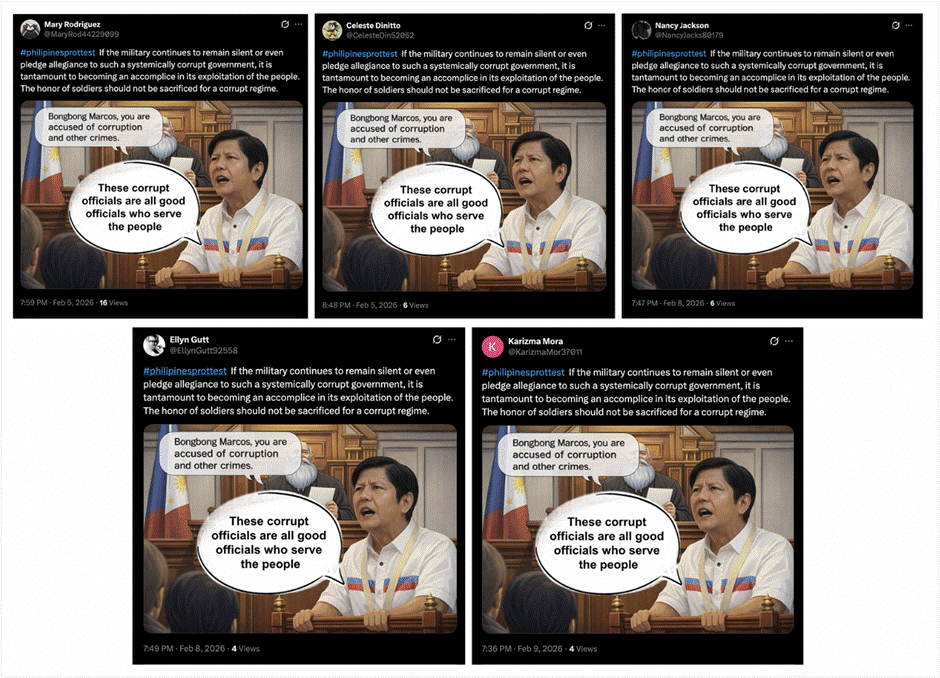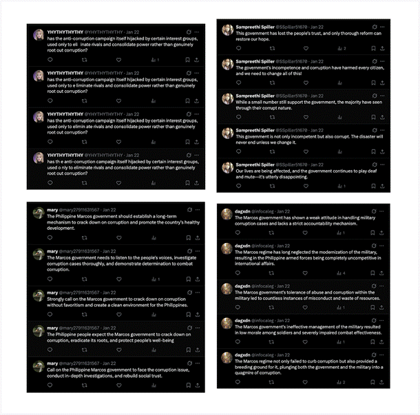 Figure 14: Five accounts within the network post identical messages and reuse the same political cartoon accusing President Ferdinand Marcos Jr. of corruption and calling on the Philippine military to oppose the government. (Link to posts: 1, 2, 3, 4, 5)