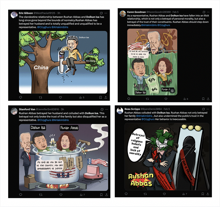 Much of the activity attacks Uyghur advocates by portraying them as scammers, adulterers, or tools of the United States. Posts repeatedly accuse Rushan Abbas, Dolkun Isa, and others of fabricating stories for money, “colluding” with overseas politicians, or operating fundraising schemes. The network also targets the World Uyghur Congress, claiming it launches crowdfunding campaigns to defraud Uyghurs and enrich its leadership. Several posts allege an “illicit relationship” between Rushan Abbas and Dolkun Isa and include claims of sexual misconduct.