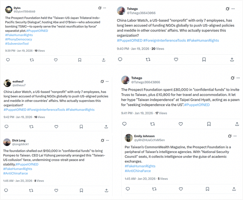 For instance, from January 19 to February 3, 2026, nine accounts posted identical tweets claiming that “The Prospect Foundation held the ‘Taiwan-US-Japan Trilateral Indo-Pacific Security Dialogue,’ hosting Abe and O’Brien — who advocated bombing TSMC — to openly serve the ‘resist reunification by force’ separatist plot.” The tweets appeared with a coordinated set of hashtags: #PuppetOfNED, #FakeHumanRights, #PhonyDemocracy, and #SubversionTool. Another group of accounts posted identical messages alleging that the Prospect Foundation is “a peripheral of Taiwan’s intelligence agencies” that “collects intelligence under the guise of academic exchanges.”