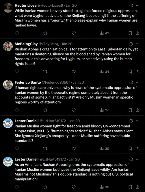 In response to a January 19 post by the Campaign for Uyghurs highlighting the U.S. government’s 2021 genocide determination and calling for enforcement of the Uyghur Forced Labor Prevention Act, multiple accounts in the network flooded the replies with critical content. These replies redirected attention to Iran, accusing Uyghur advocates of hypocrisy and selective concern for Muslim suffering. Accounts criticized Rushan Abbas and other activists of “remain[ing] silent” on Iranian women allegedly beaten or killed for violating hijab rules, with at least one account claiming to be a U.S. citizen.
