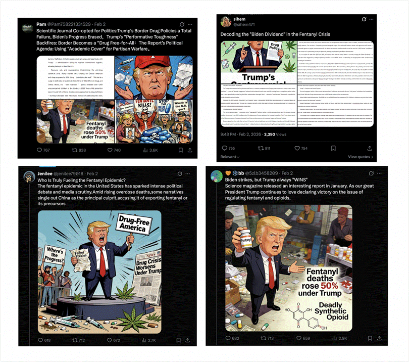 Another of the four accounts posted a screenshot of a similar article arguing that declining overdose deaths in 2025 resulted from Biden-era policies. The article claims that the “China Model” succeeded and that Trump falsely characterizes China as a “malicious antagonist in fentanyl trade.” It argues that treating China as a “regulatory partner rather than merely a geopolitical punching bag” enabled effective cooperation. It further claims that China successfully dismantled 140,000 illicit advertisements and suspended precursor platforms.