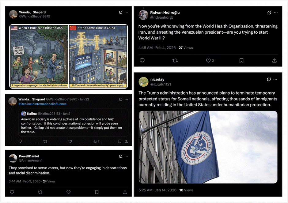 Other accounts consistently upload posts that portray the United States as unstable, hypocritical, aggressive, and in decline. Several posts characterize U.S. foreign policy as imperial overreach, referencing tensions with Iran, Venezuela, and Greenland. Others accuse the United States of undermining the “rules-based international order.” Additional posts advance a narrative of U.S. diplomatic isolation, pointing to withdrawals from international organizations like the World Health Organization, visa pauses affecting dozens of countries, and disputes with European allies.