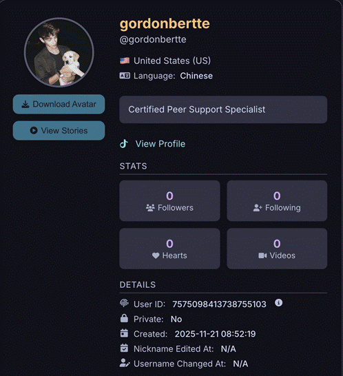 Figure 20: A TikTok account linked to a Gmail address promoted by @GordonBert33 lists the United States as its location but uses Chinese as its default language.