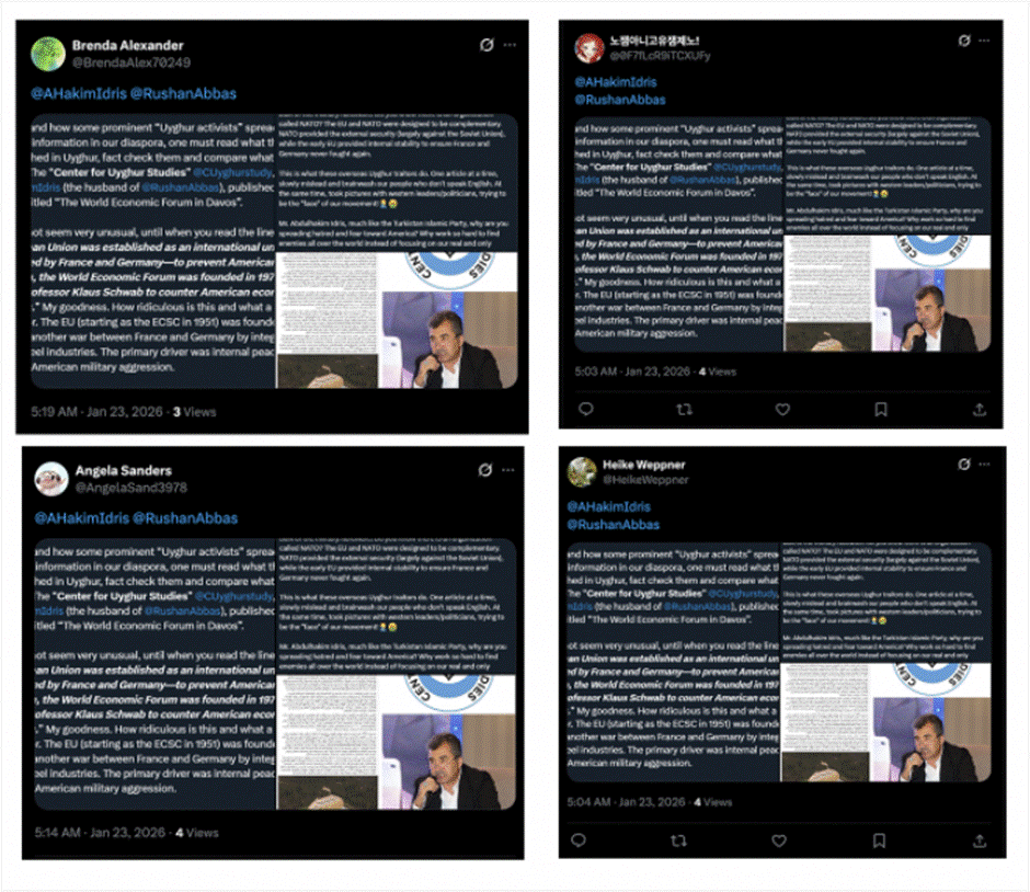 Figure 7: Four accounts within the network targeting Rushan Abbas and Dolkun Isa. (Link to posts: 1, 2, 3, 4)