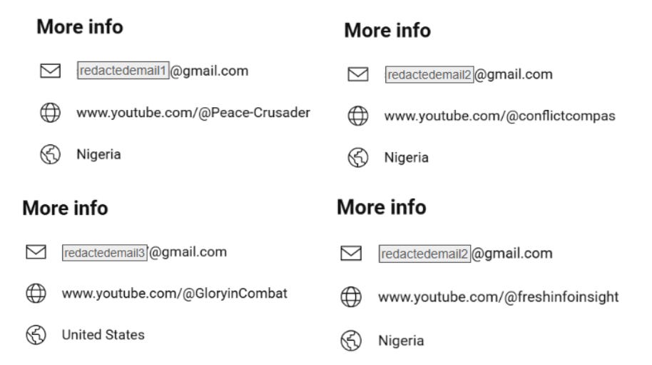 All 5 channels explicitly list their location in Nigeria. 4 also expose the email of the channel’s creator. By analyzing publicly listed email addresses, we found that four of the five channels appear to be operated by a small, related group of individuals based in Nigeria. We have deliberately redacted full names, emails, and social profiles due to inconclusive evidence about intent, funding, or ideological alignment.