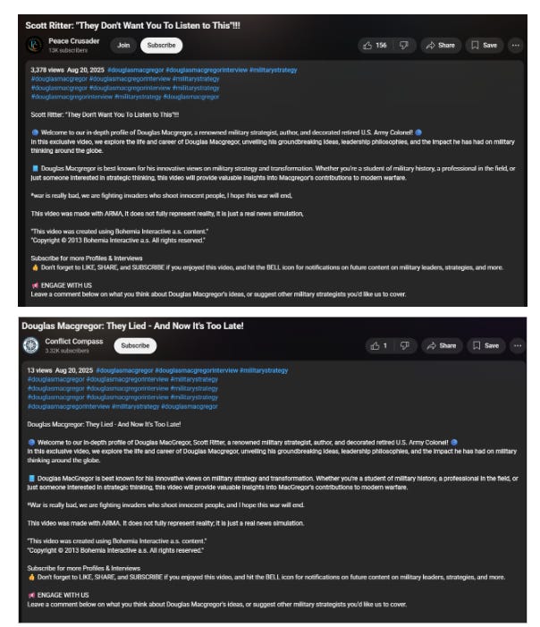 The channels’ videos also often have identical descriptions, frequently using identical or overlapping hashtags like #militarystrategy and #douglasmacgregorinterview.