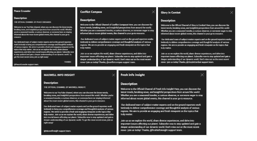 Figure 10-12: Nearly identical video descriptions from @Peace-Crusader, @conflictcompas, and @DaddyMaxwell77