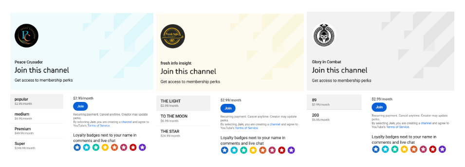 Figures 24-26: Paid membership options offered by @Peace-Crusader, @freshinfoinsight, and @GloryinCombat